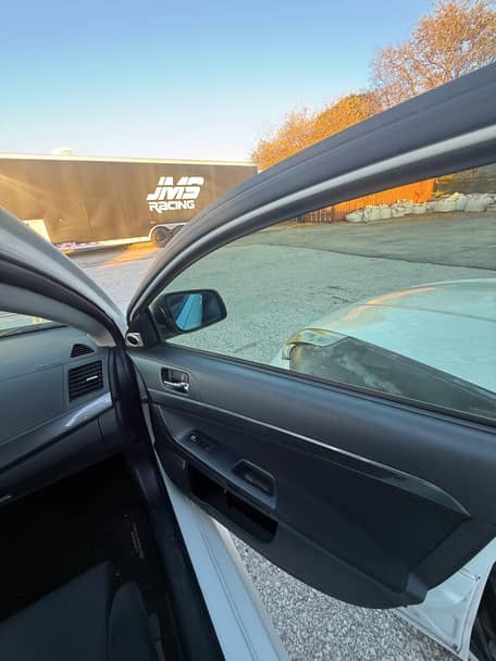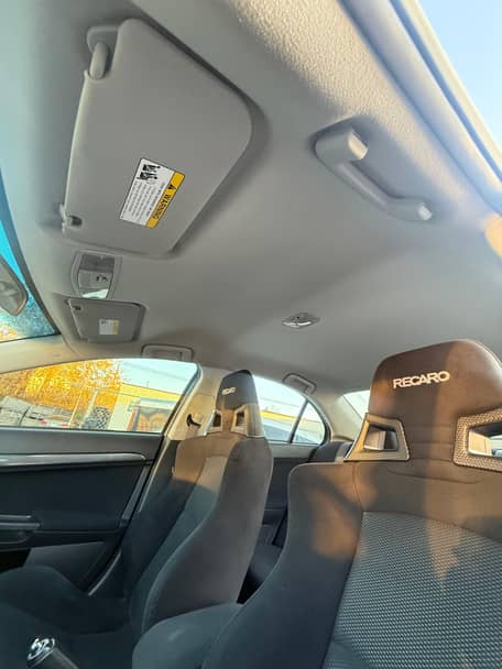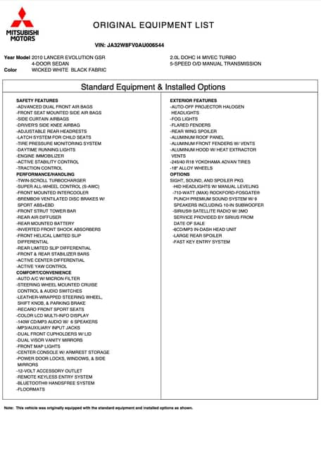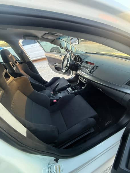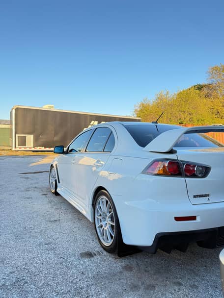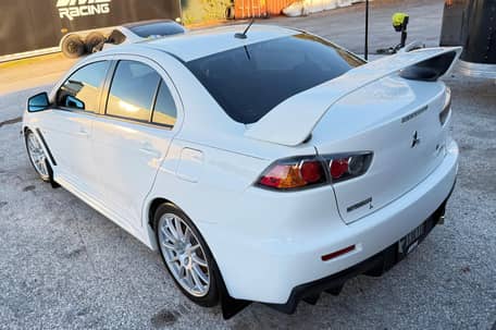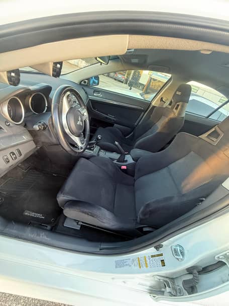 Voici une Mitsubishi Lancer Evolution X GSR de 2010, de couleur Wicked White avec un intérieur noir.