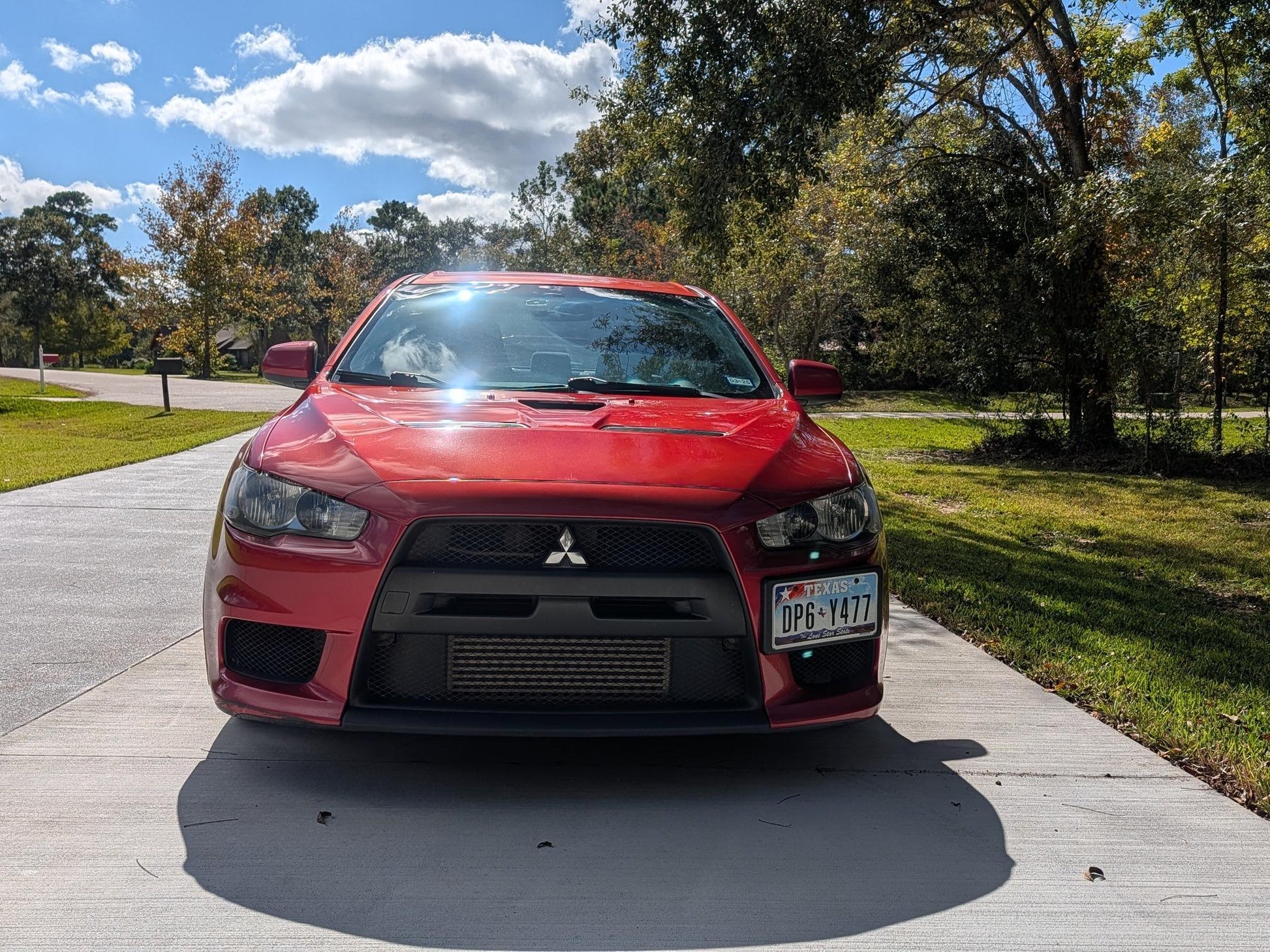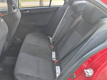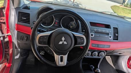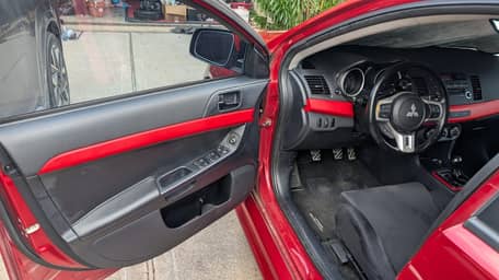 Voici une Mitsubishi Lancer Evolution X GSR de 2012, de couleur rouge Rallye avec un intérieur noir.
