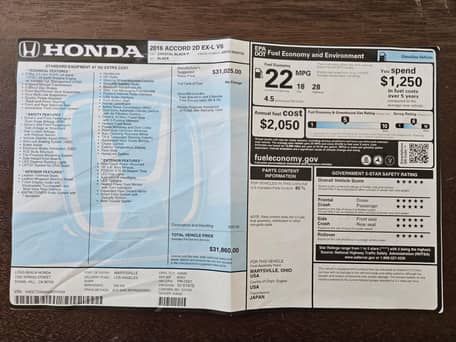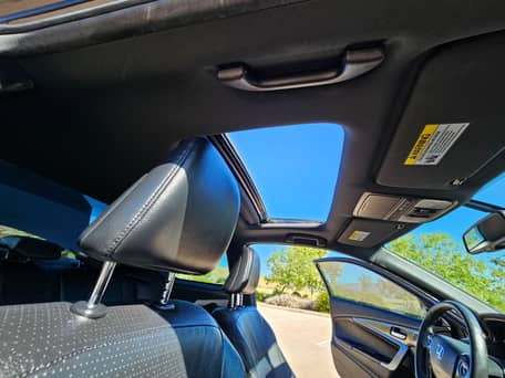 - Selon l'étiquette de la vitre fournie dans la galerie, l'équipement d'usine comprend des jantes de 18 pouces, un toit ouvrant électrique, une sellerie en cuir, des sièges avant chauffants et à réglage électrique, le système d'entrée intelligente, un écran tactile central de 7 pouces, la compatibilité avec Android Auto et Apple CarPlay, et une caméra de recul.