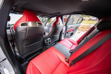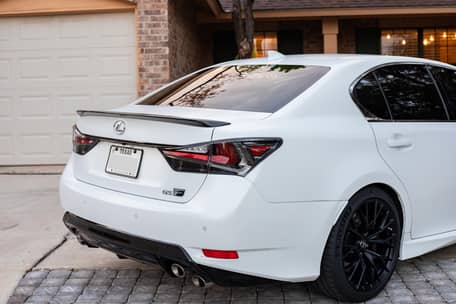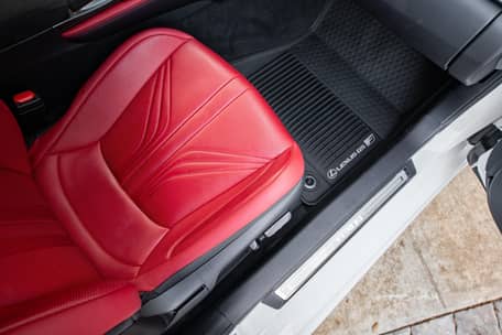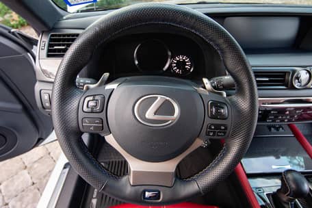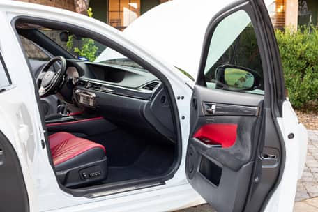 Here is a 2020 Lexus GS F, in Ultra White with a Circuit Red interior.