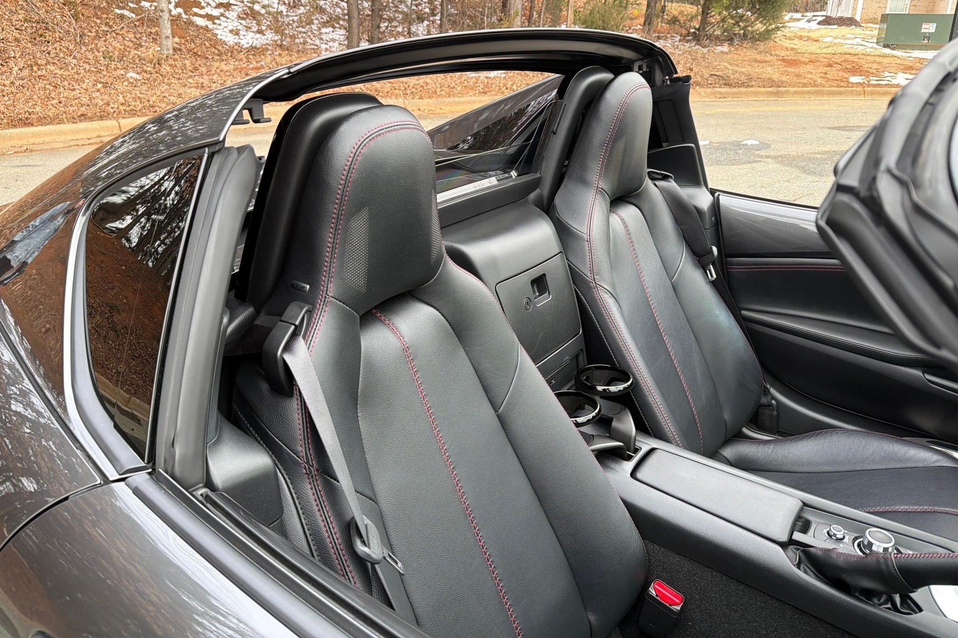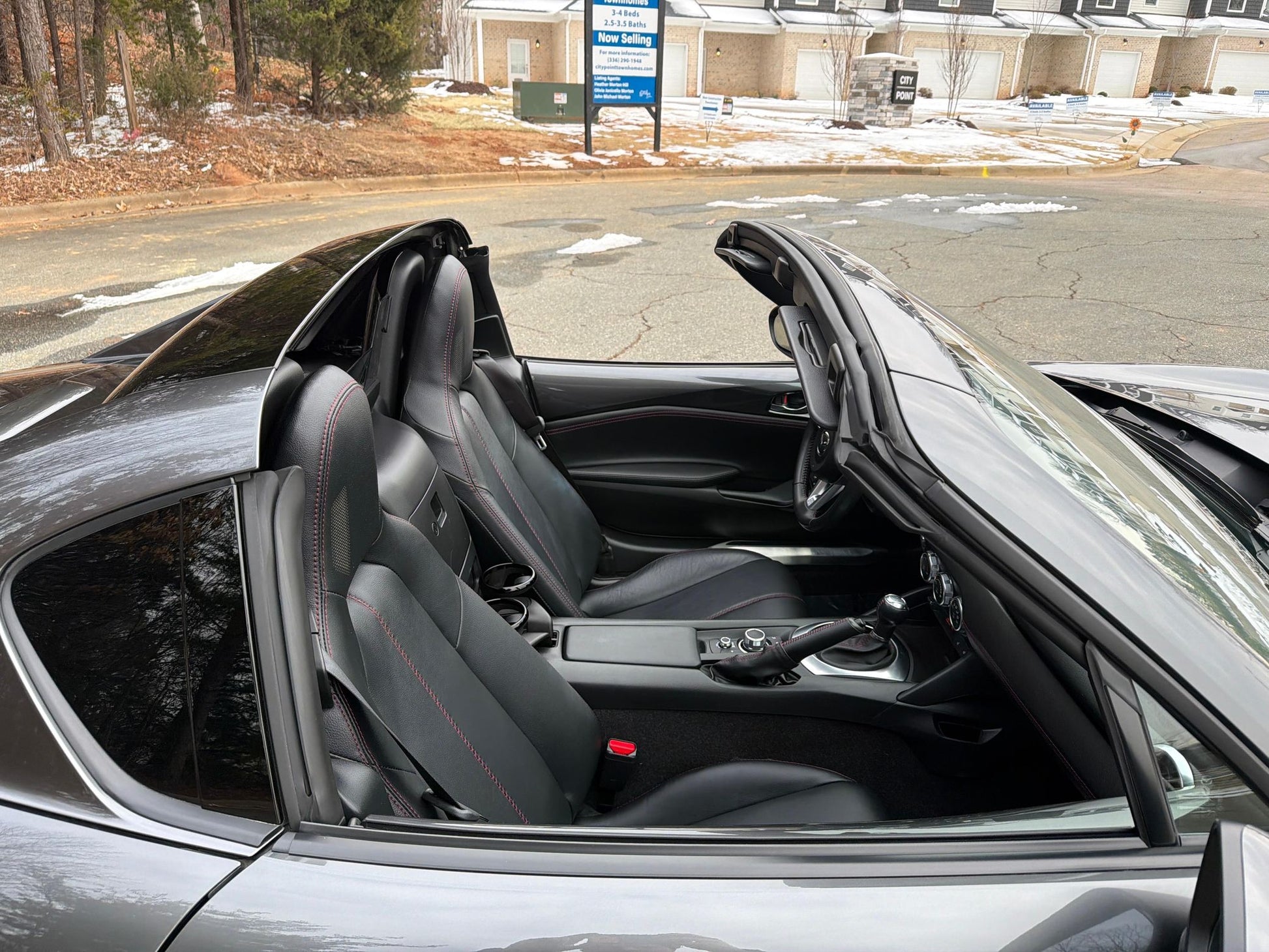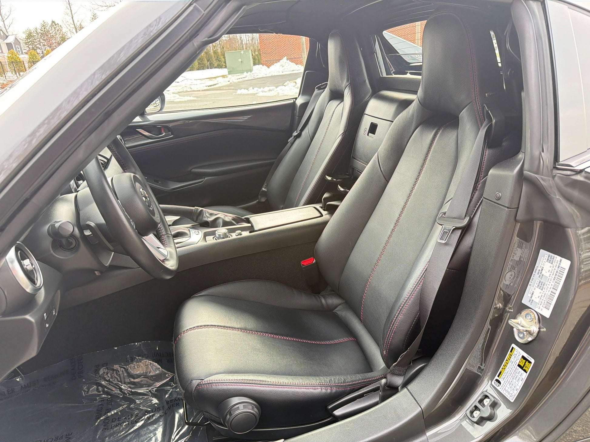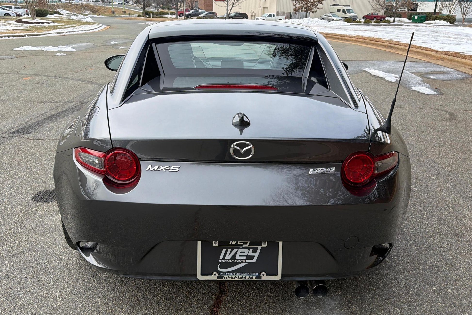 According to the price tag visible in the gallery, this Miata RF is a Grand Touring model. Standard features include 17-inch wheels, a power-retractable hardtop, leather upholstery, heated seats, and a Bose audio system. The selling dealership reports no significant modifications.