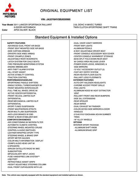 - Notable features include the Interior Sport Pack (aluminum gear knob and handbrake handle), 18-inch alloy wheels, an active center differential, front and rear limited-slip differentials, sport suspension, front and rear stabilizer bars, Ralliart body elements, Sportronic shift paddles, aluminum pedals, and much more, as detailed below.