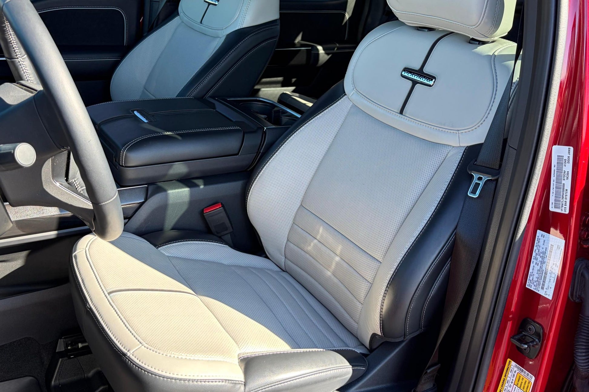 Voici… un Ford F-150 Lightning Platinum 2024, de couleur rouge métallisé Rapid Red avec un intérieur noir.
