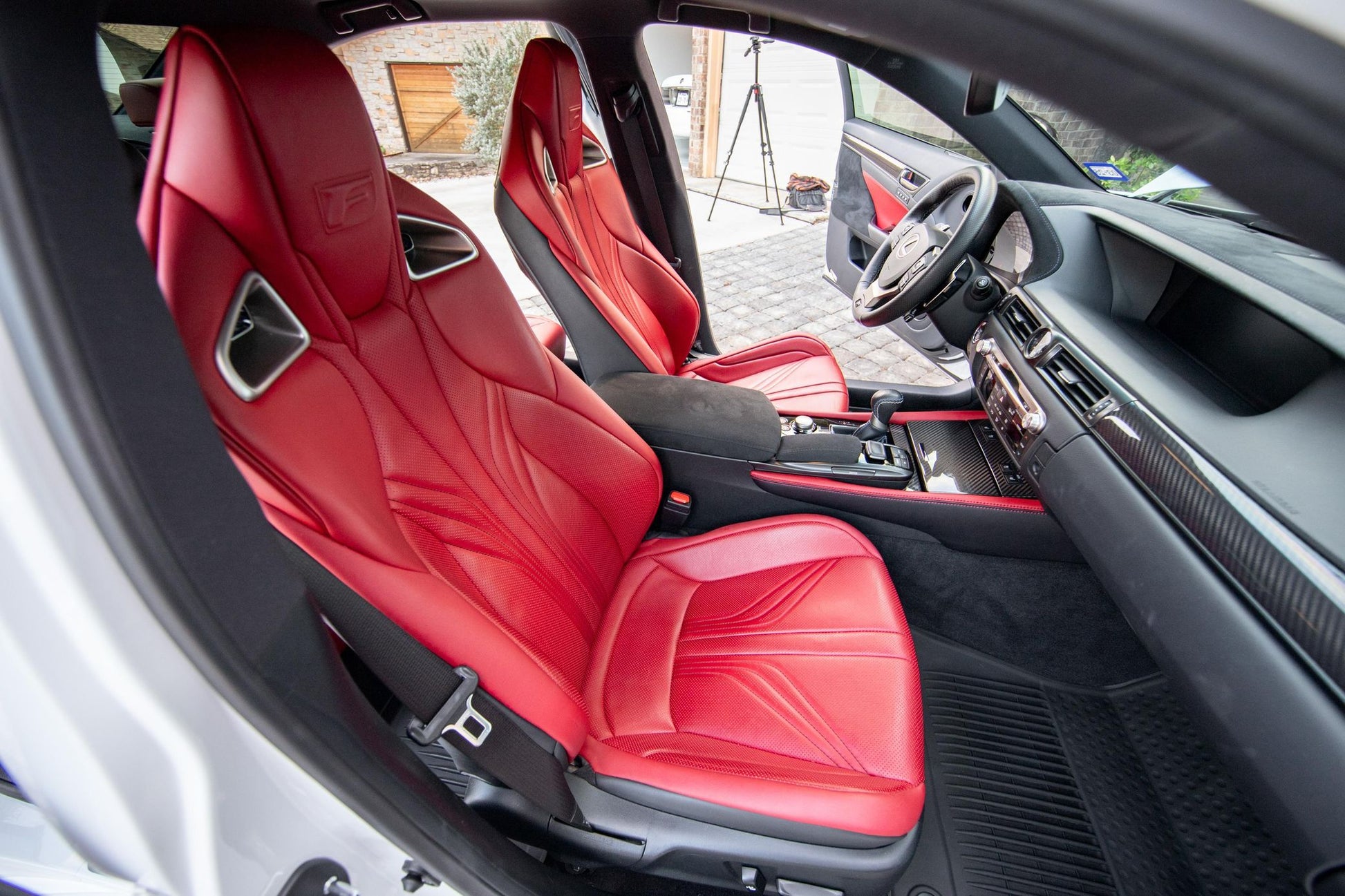 Voici une Lexus GS F 2020, de couleur Ultra White avec un intérieur Circuit Red.